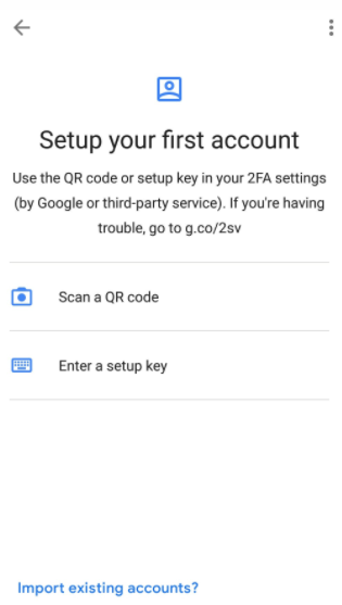 Right away, two options will appear that we can use to add an account that will be used for two-factor authentication (2FA). They are: Read QR Code and Enter Configuration Key. Our option of interest later will be "Scan QR code".