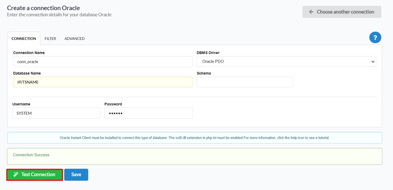 - Connection Name: You can use any name to identify the connection — by default, Scriptcase sets the name as “conn_oracle.”