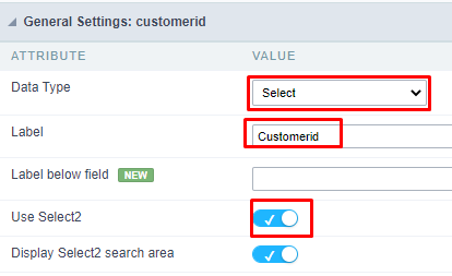 2. Next, we will go to the option "Fields", because we will change the type of the field "customerid" to 'Select' and activate the option "Use Select2".