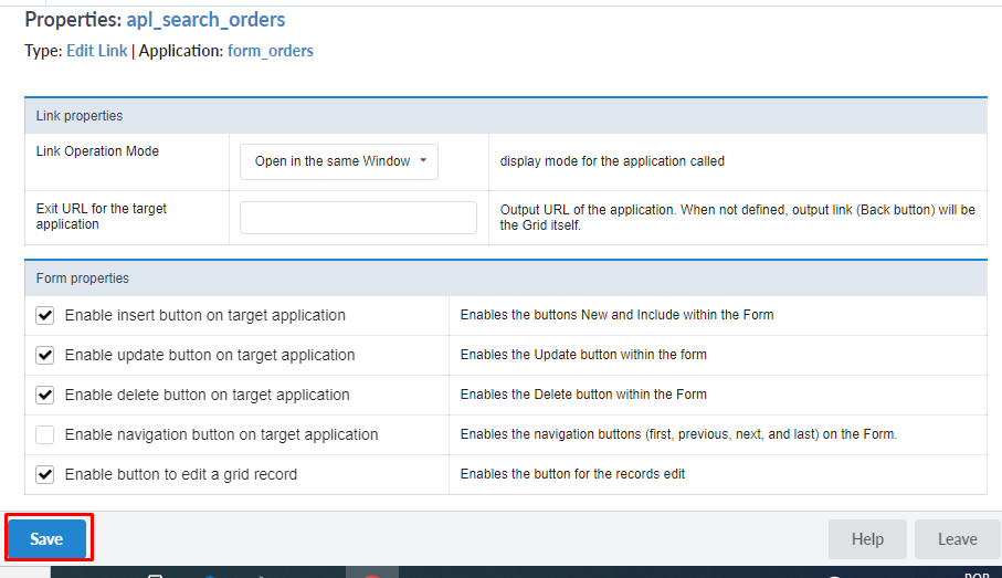 10. After all these adjustments have been made, we will go to the "search_orders" application, and in the "Application Links" option, we will link the application with the "form_orders" that we have just created.
