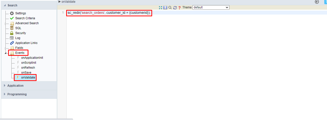 4. As the idea is to access the Form by going through 2 applications of the type "Search" beforehand, we will need to redirect the application "search_customers" to "search_orders", through the onValidate event, passing the following parameters below in the sc_redir() macro
