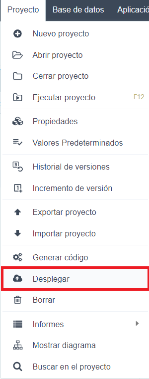 Este tipo de despliegue está destinado a los usuarios que desean utilizar la configuración predeterminada del entorno de producción (Bibliotecas comunes), esta configuración la realiza automáticamente Scriptcase. El proceso se describe a continuación:Paso 1: Accede a tu proyecto y elige la opción "Proyecto -> Despliegue", disponible en el menú superior.