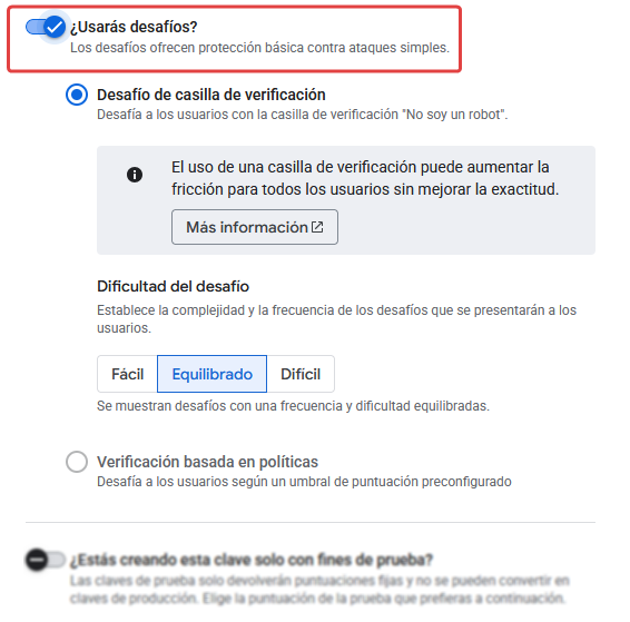 Esta etapa de configuración es opcional y define si se utilizará o no el desafío, como el checkbox "No soy un robot" o desafíos de imagen.