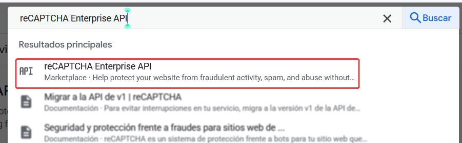 También es posible acceder a la página de activación de la API buscando: reCAPTCHA Enterprise API
