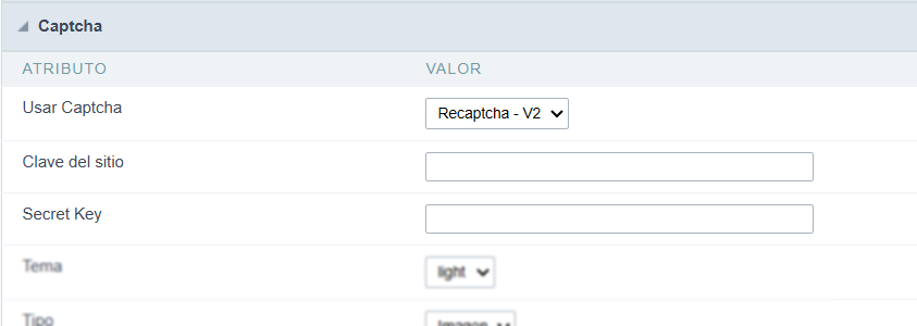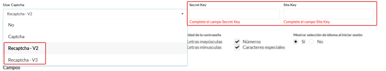 Las claves obtenidas en los pasos 7. Obtener la Site Key y 8. Obtener la Secret Key deben utilizarse para configurar Recaptcha -V2 o Recaptcha -V3.