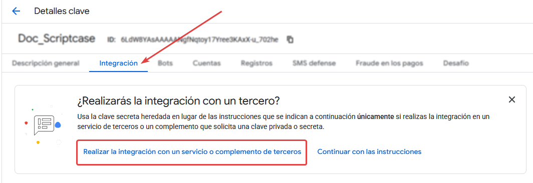 Para obtener la Secret Key, haga clic en Integrar con un servicio de complemento externo