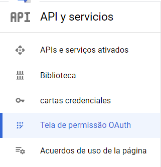 3) En el menú de la izquierda ("API y servicios"), haga clic en "Pantalla de permiso de OAuth":