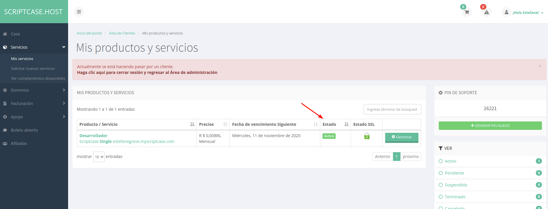 para iniciar sesión en el centro de atención al cliente (client.scriptcase.host).
