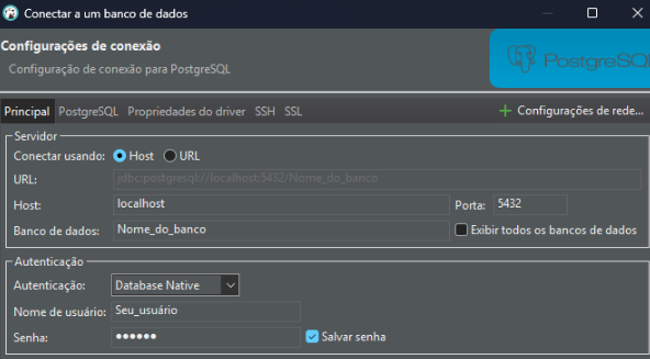 Después de seleccionar PostgreSQL, configura los siguientes campos: