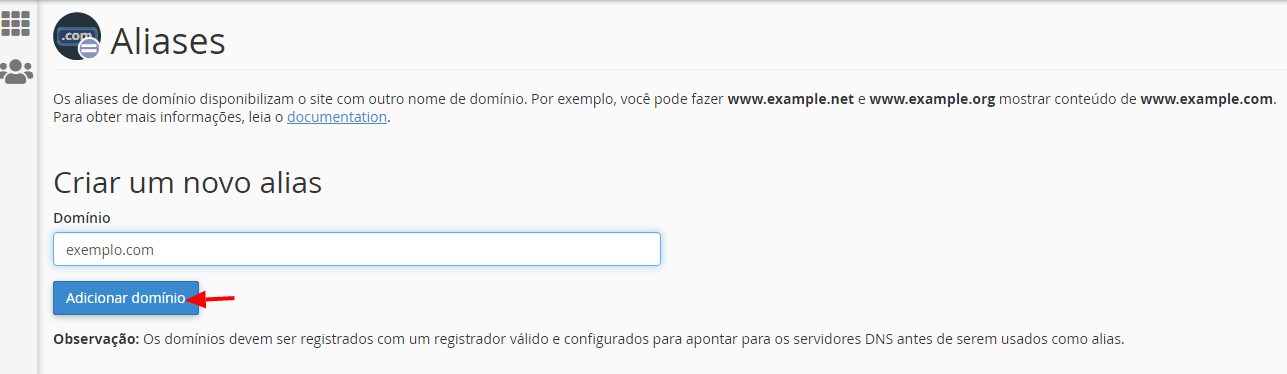 2. Na seção "Domínios", clique no ícone "Aliases".3. Em "Criar um novo alias", você deve inserir um nome de domínio válido que deseja estacionar no campo de texto e clicar no botão "Adicionar domínio".
