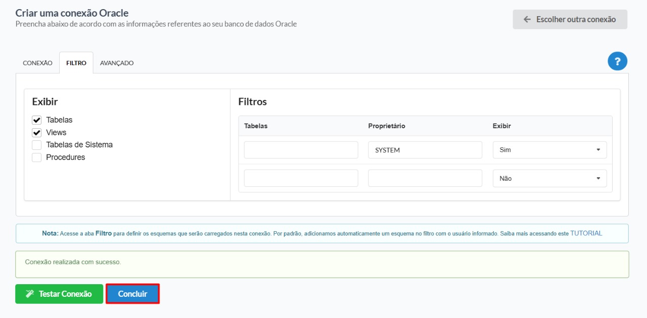 Após configurado, clique em "Concluir".No exemplo abaixo, somente os dados do SCHEMA "SYSTEM" serão exibidos no momento da criação das aplicações.