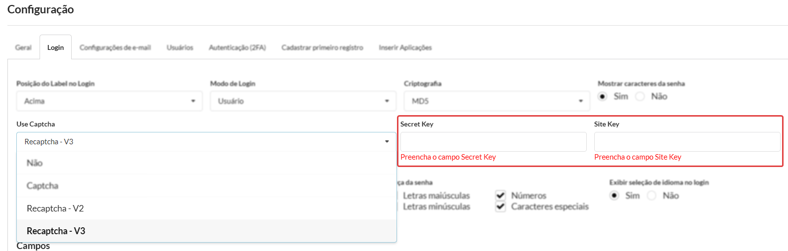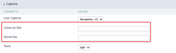 As chaves obtidas nos passos 7. Obtendo Chave do Site e 8. Obtendo Secret Key devem ser utilizadas para configurar o Recaptcha -V2 ou Recaptcha -V3.