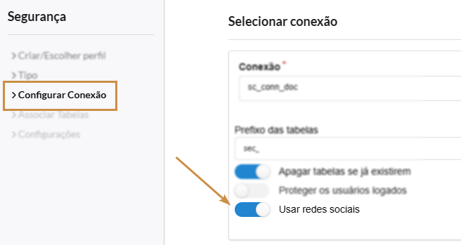 1. Para utilizar o login pelo facebook no módulo de segurança, na etapa Configurar Conexão durante a criação do módulo, você deve marcar Usar redes sociais.