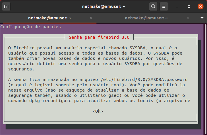 - Se quisermos reconfigurar a senha do Firebird, insira o seguinte comando: sudo dpkg-reconfigure firebird3.0-server